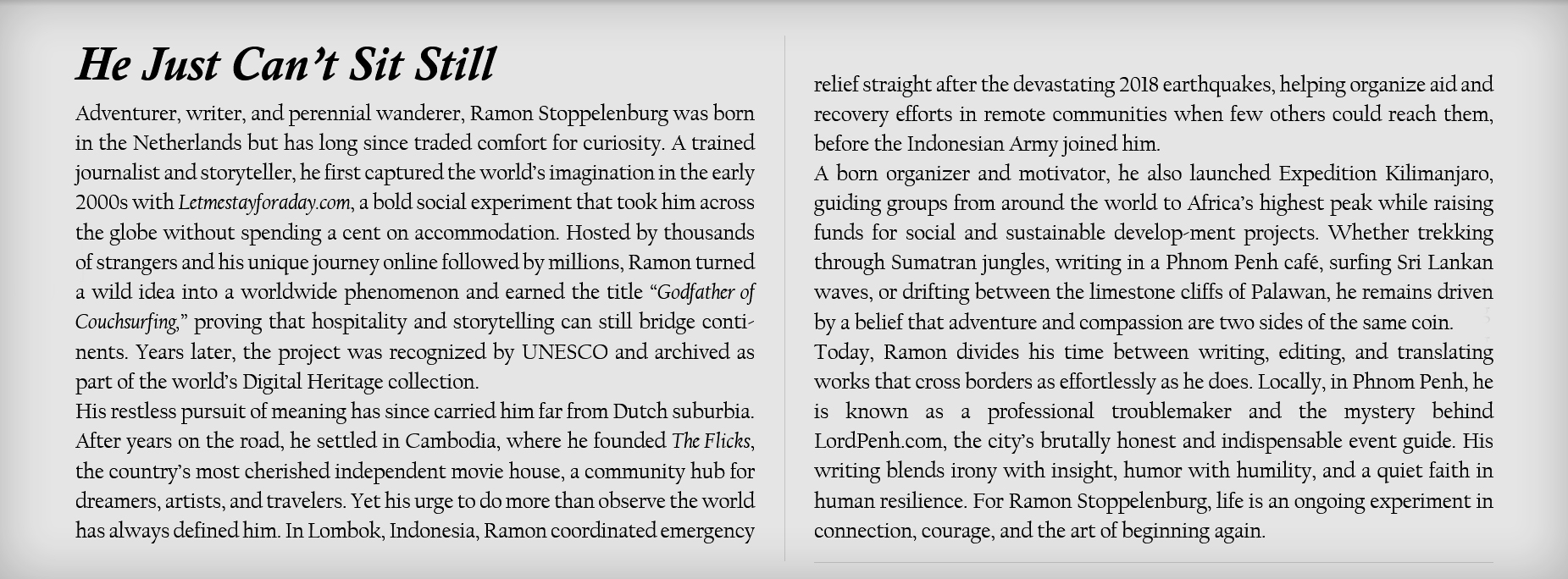 My name is Ramon Stoppelenburg and I am a writer, adventurer, creative entrepreneur, and one of the earliest digital pioneers of the Netherlands. My life has always been guided by a mix of curiosity, nerve, an instinct for going off-script, and an unshakable belief that stories, and the people behind them, matter.